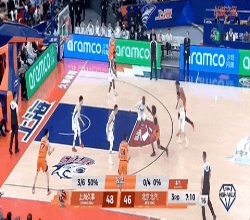 杰曼面对刘礼嘉,从左路突进,将球塞给塔瑞克,后者跃起擦板得分。古德温带球,分刘礼嘉后回传到自己手上,正面拔起三分不进。杰曼拿到篮板,一条龙直冲篮下,拉杆再进!北京队将比分逼近到30-34,上海队叫停比赛。