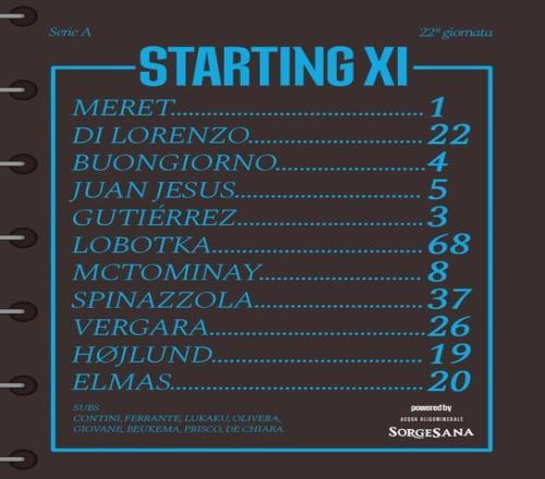 那不勒斯首发:1-梅雷特、5-热苏斯、4-布翁焦尔诺、22-迪洛伦佐、3-古铁雷斯、8-麦克托米奈、68-洛博特卡、37-斯皮纳佐拉、20-埃尔马斯、19-霍伊伦、26-韦尔加拉