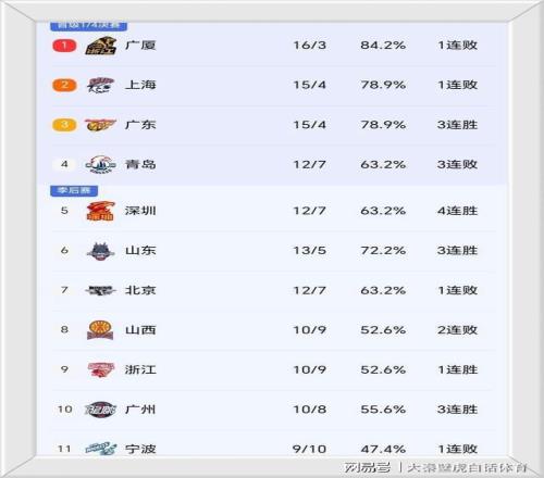 ①、广厦+上海+青岛集体输球,排名仍位居前4,四连胜的深圳队胜场数已经追平青岛;